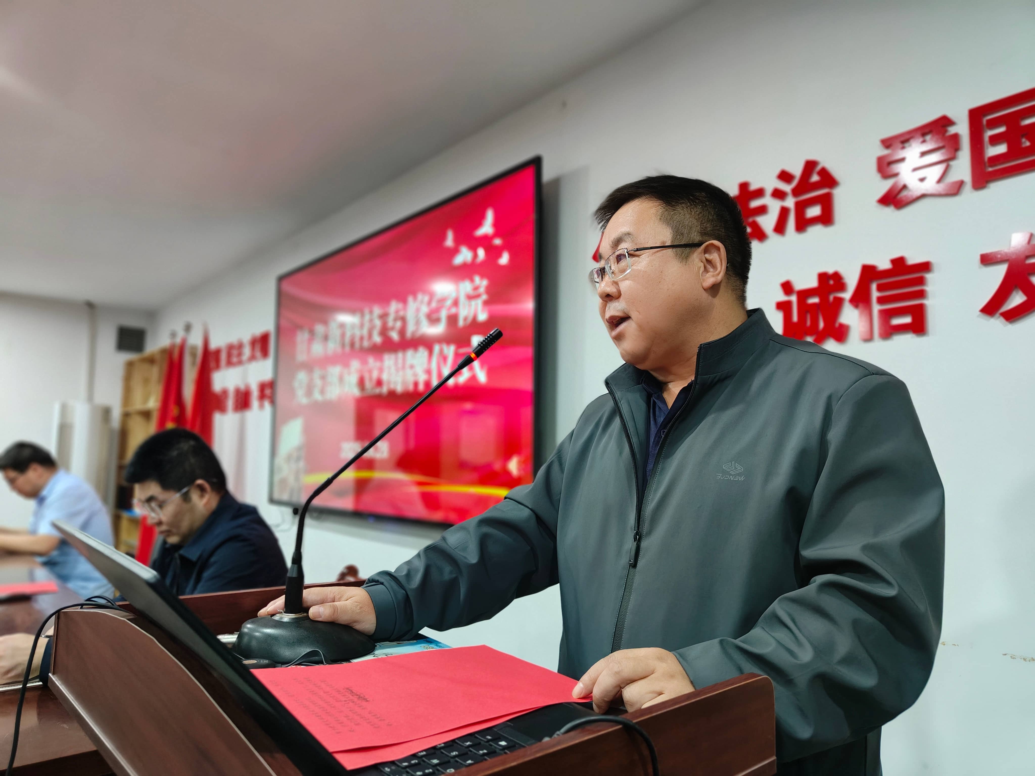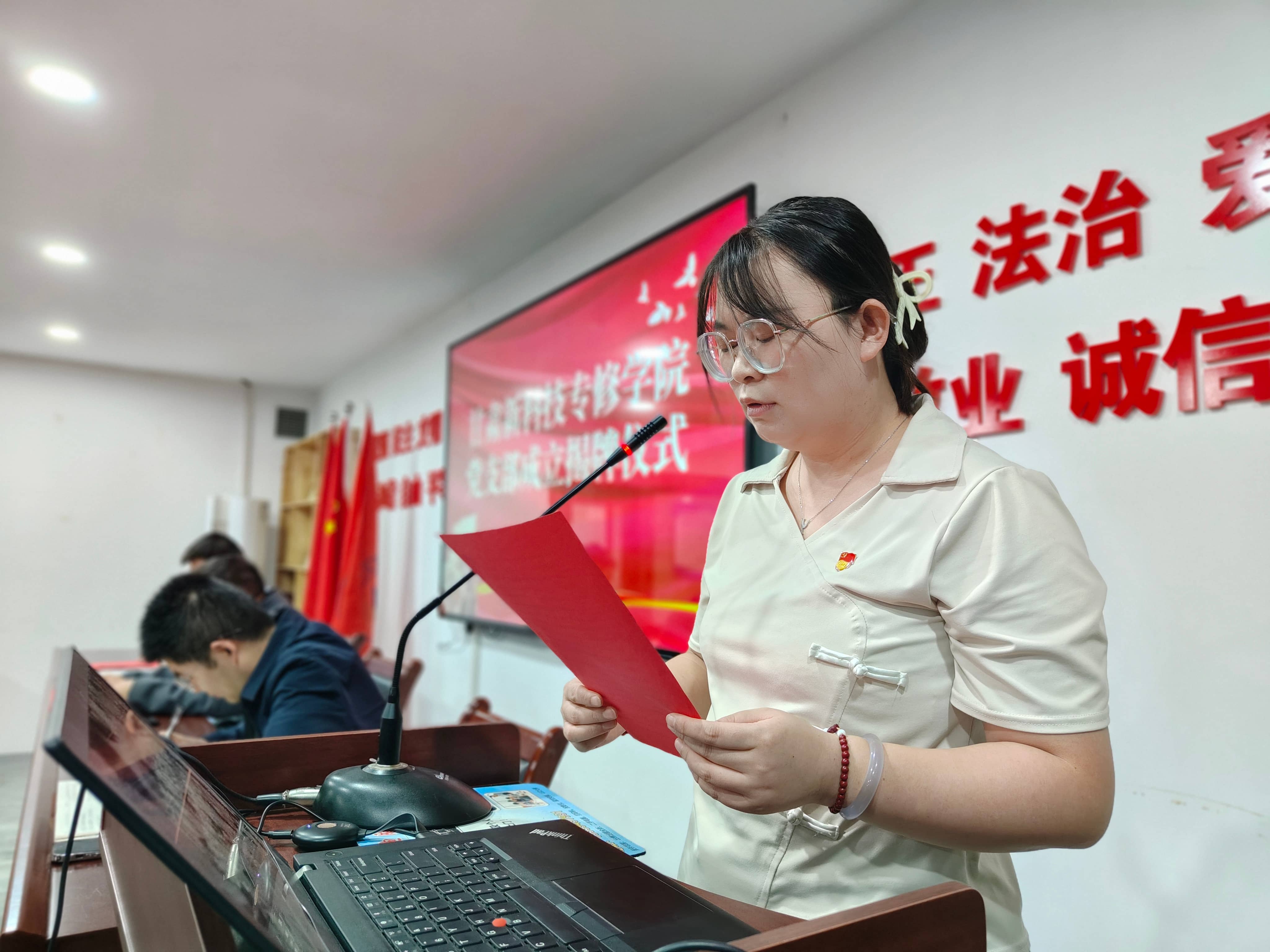 仪式伊始,全体老师肃立奏唱国歌,庄严的旋律凝聚起奋进的力量。随后,学院陈院长代表宣读了关于同意成立甘肃新科技专修学院党组织的批复文件,明确了党组织的组织架构与职责使命 。