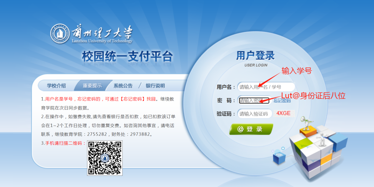 1.学生缴费前,请仔细阅读《兰州理工大学校园统一支付平台》“系统公告”下的“兰州理工大学校园统一支付平台使用说明(继续教育学院版本)”。登录密码以此通知为准,请牢记!密码忘记,请通过“忘记密码”自行找回。
