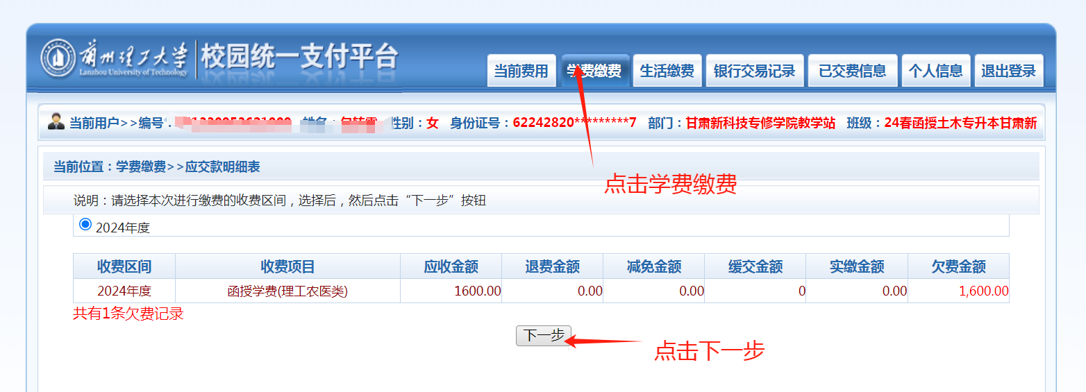 第二步:点击“学费缴费”--“下一步”,如下图所示: