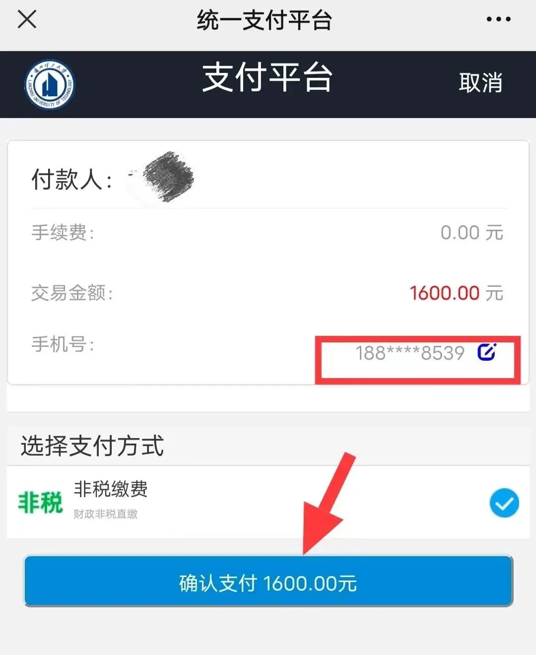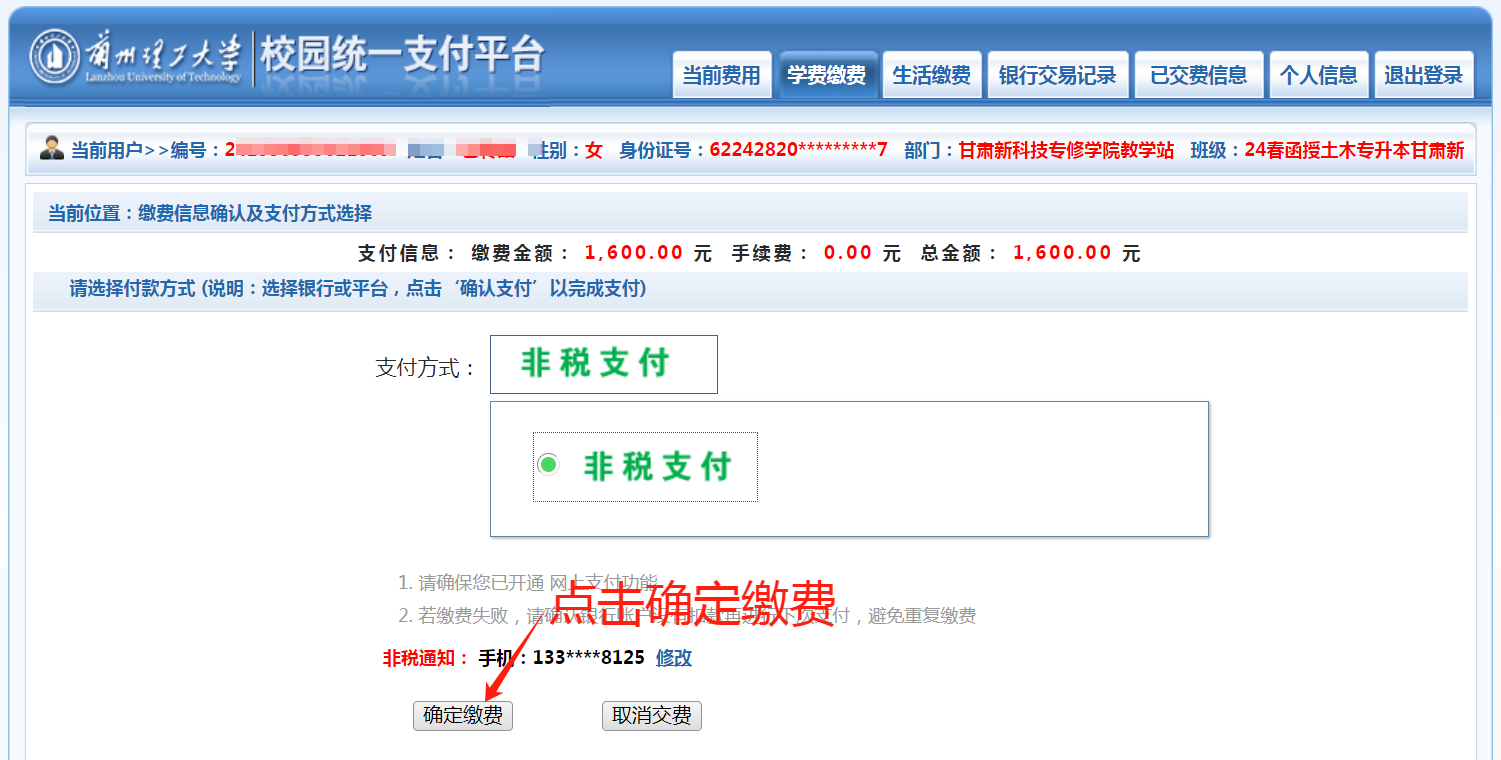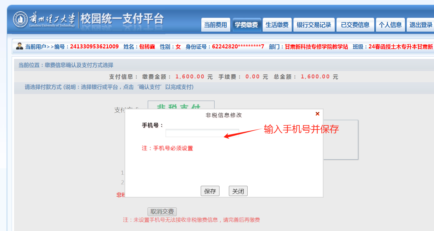第五步,输入本人手机号(电话号码务必准确),点击“保存”--“确认支付”然后支付完成即可,如下图所示:
