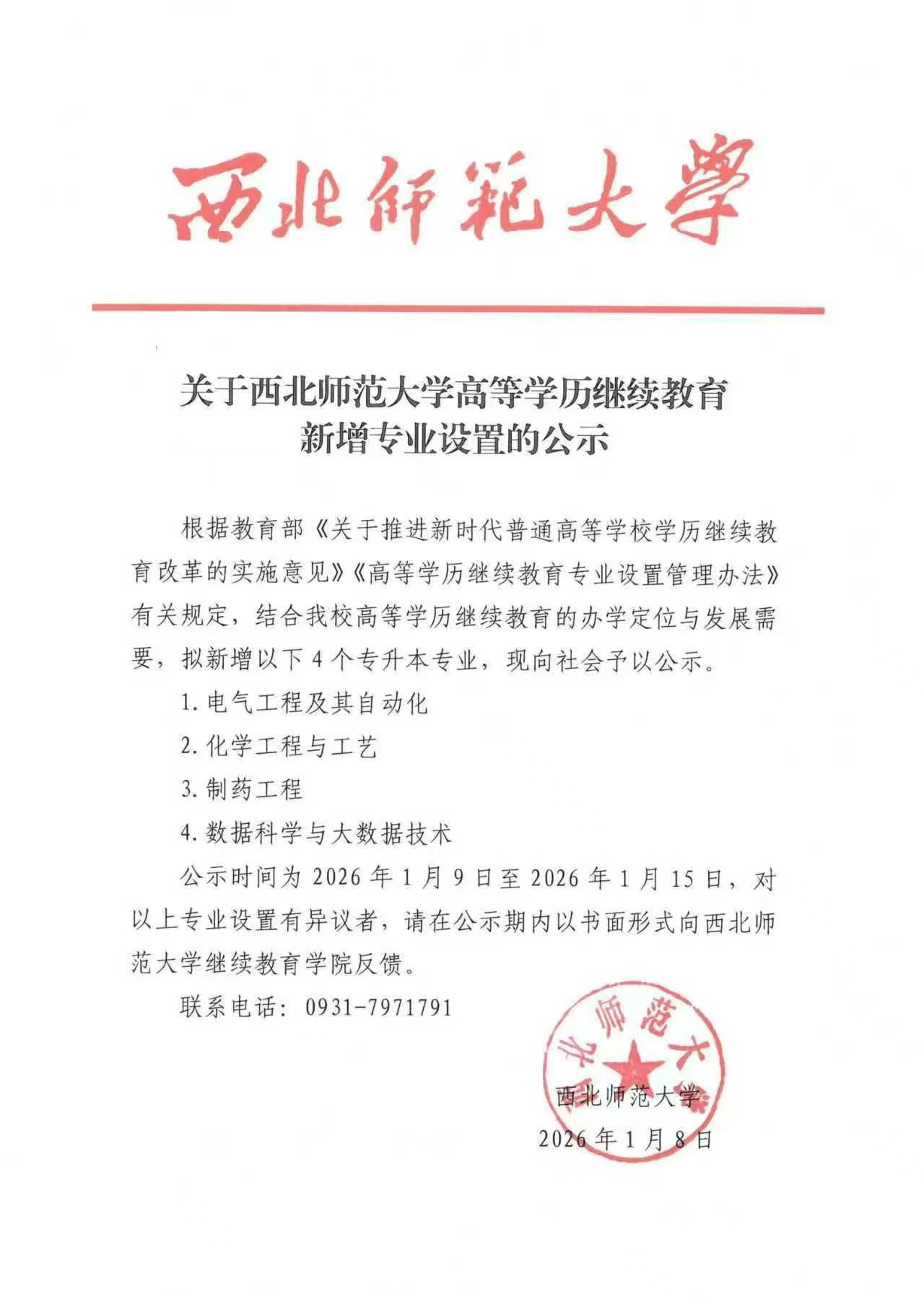好消息!西北师范大学继续教育学院最新公示,为满足社会对高技能人才的需求,现拟新增4个专升本专业,我教学站点将同步开启预报名通道。